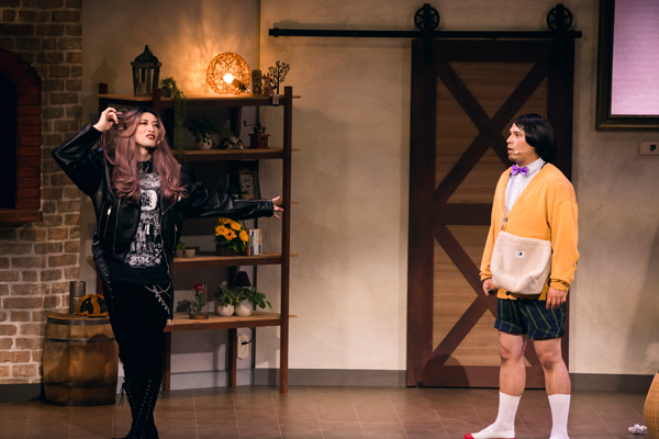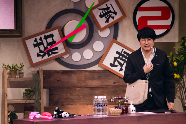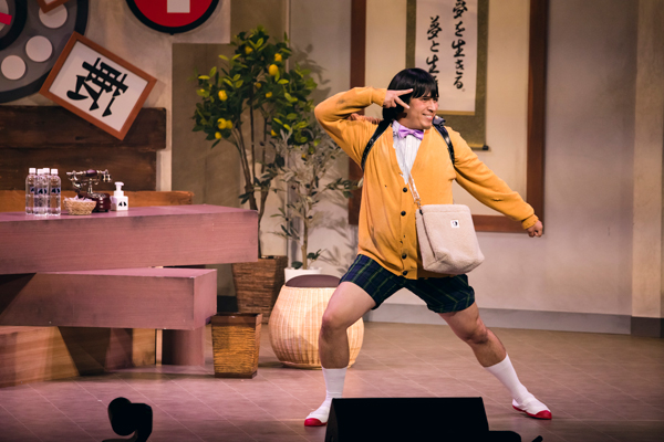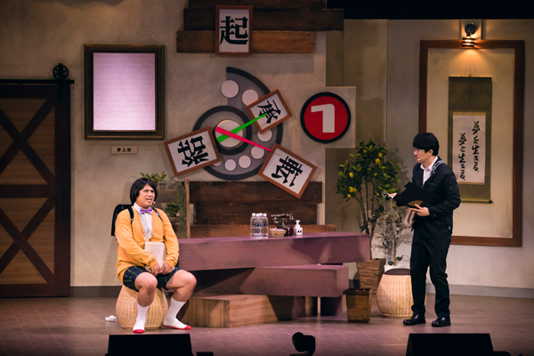 第一幕が始まると、杉?はいきなりアドリブワードを引き、若者の間で流行っている「ウシャ?!」という謎の挨拶をします。杉?がいるのは、時刻の代わりに“起”、“承”、“転”、“結”の文字が刻まれた不思議な時計が印象的な部屋でした。そこへ、自称11歳の天才子役、勇太がやってきます。傷んだカーディガンを着た勇太を見て杉?は心配しますが、勇太は“ボロボロの方がオシャ”だと自慢します。