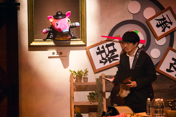 舞台を見回すと、ところどころ夢之助本舗のロゴマークにもあしらわれているバクのマークがあり、スーツ姿の杉?が持っているファイルにも同じマークがあります。壁には“夢を生きる、夢と生きる”と経営理念が書かれた掛け軸が下げられており、“夢”への強いこだわりが感じられる部屋です。