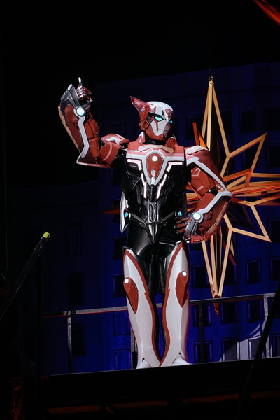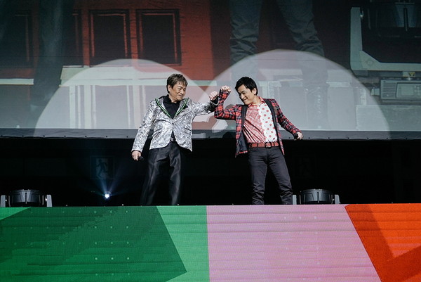 イベントもクライマックスに近づく中、UNISON SQUARE GARDENのライブセッティングが完了するまでのお楽しみタイムとして、ヒーロースーツが会場前方から後方までトロッコで移動。観客は新しくなったスーツを間近で見ることができた。さらに、津田、岡本からのビデオメッセージが流されたほか、観客全員でウェーブを行い、会場の一体感は最高潮に。