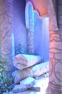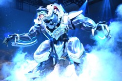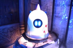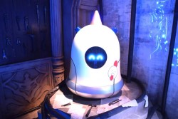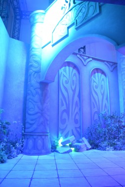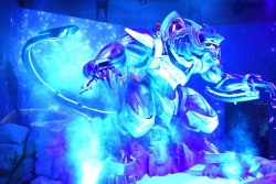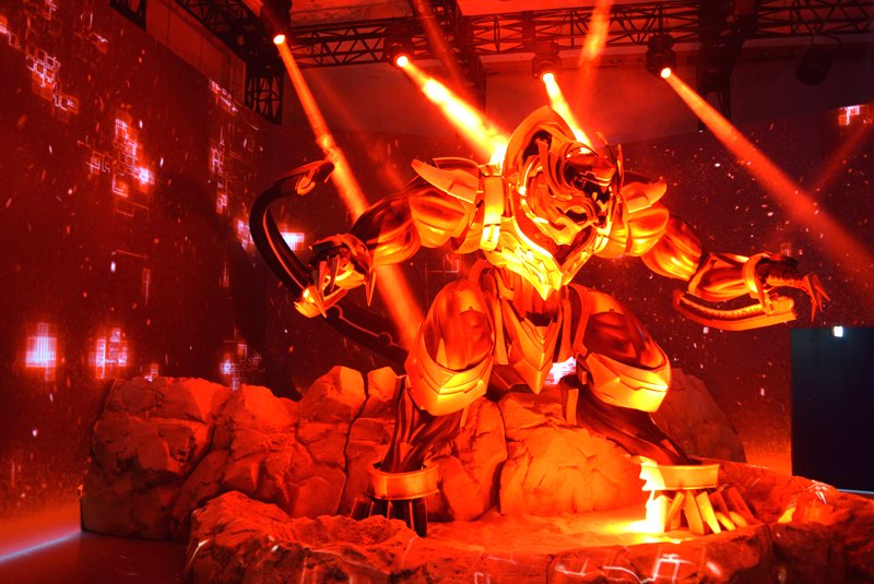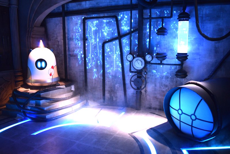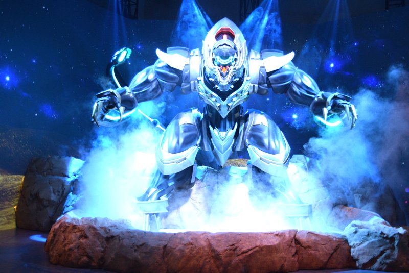 作戦室を抜け、宇宙船か月の都市のような通路を進むと全長約3.5mの機神・セスラカの巨大立像が! 細かいパーツから発光部まで精巧に再現されており、プロジェクトマッピングにより岩が吹き飛ぶ映像演出やスモーク、サウンドにより迫力満点です。