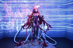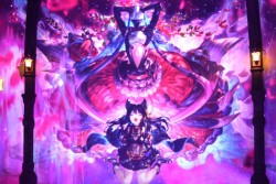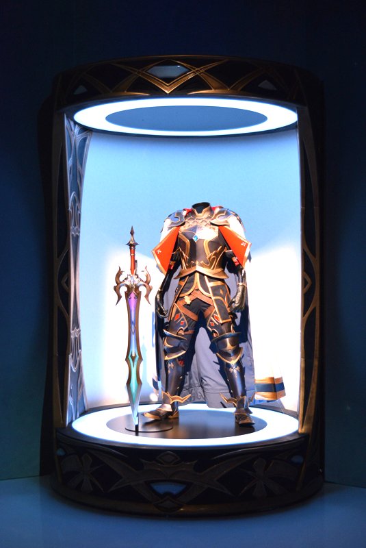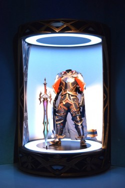 十天衆の展示では、円柱の空間全体を使った演出で、十天衆たちが眼前にいるような気迫を体感できます。また、本イベントが初展示となる“十天衆を統べし者”の衣装にも注目。イラストをそのまま立体化したような細かい刺繍や模様はもちろんのこと、エリアの中央にたたずむ姿は十天衆とあわせて荘厳さすら感じさせます!
