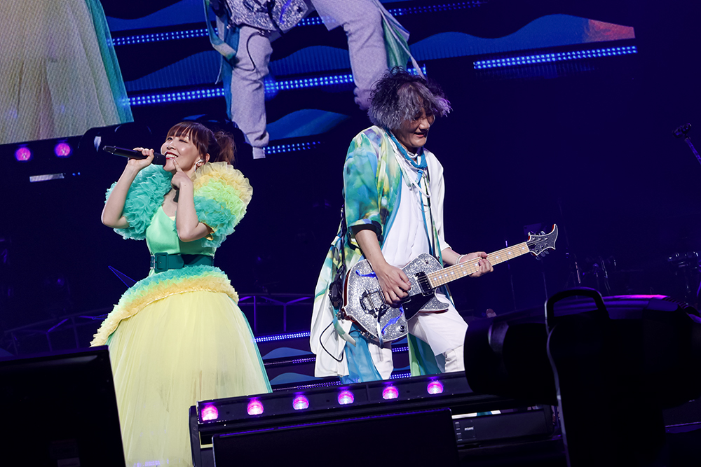 アニサマ2022 2日目最後のアーティストはFLOW。ステージに現れると会場からは歓声の代わりに一際大きな拍手が。アニメ『コードギアス 反逆のルルーシュ』シリーズより『COLORS』『DICE』を歌唱して、会場を沸き立たせます。MCでは、ライブの制限として声が出せないことについて「なんて地獄だ」と評しつつ、見劣りしない熱気に対する感動を述べた他、初のトリを務めることへの感謝を伝えました。