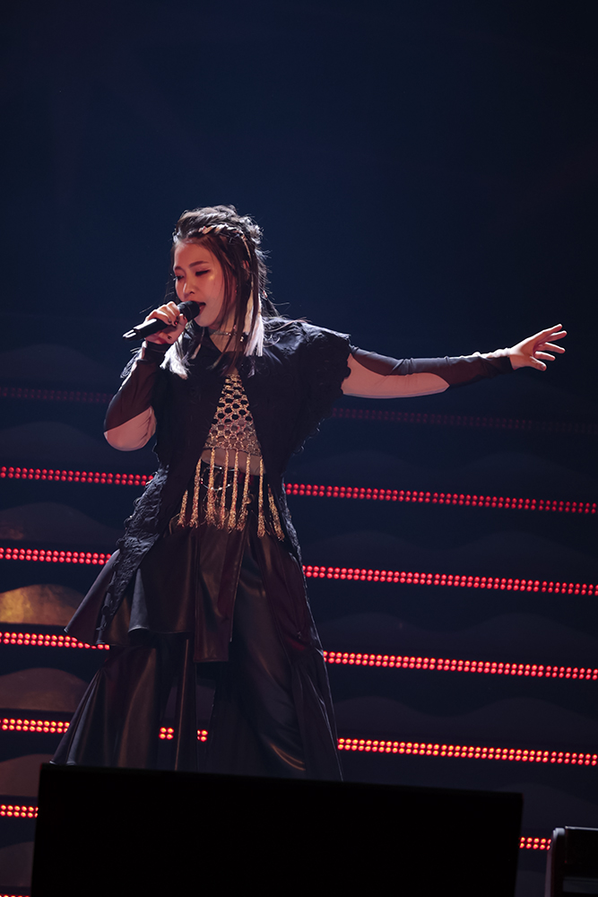 「魂の色は 何色ですか」と『ANIMA』を力強く歌いながら登場するReoNaさん。バンド&ブラスサウンドもパワフルに演奏する中、それに負けない歌声を披露すると観客も力強いクラップで答えます。『Rea(s)oN』は自らもギターを弾きながら歌唱。どこまでも伸びる歌声で会場を魅せます。