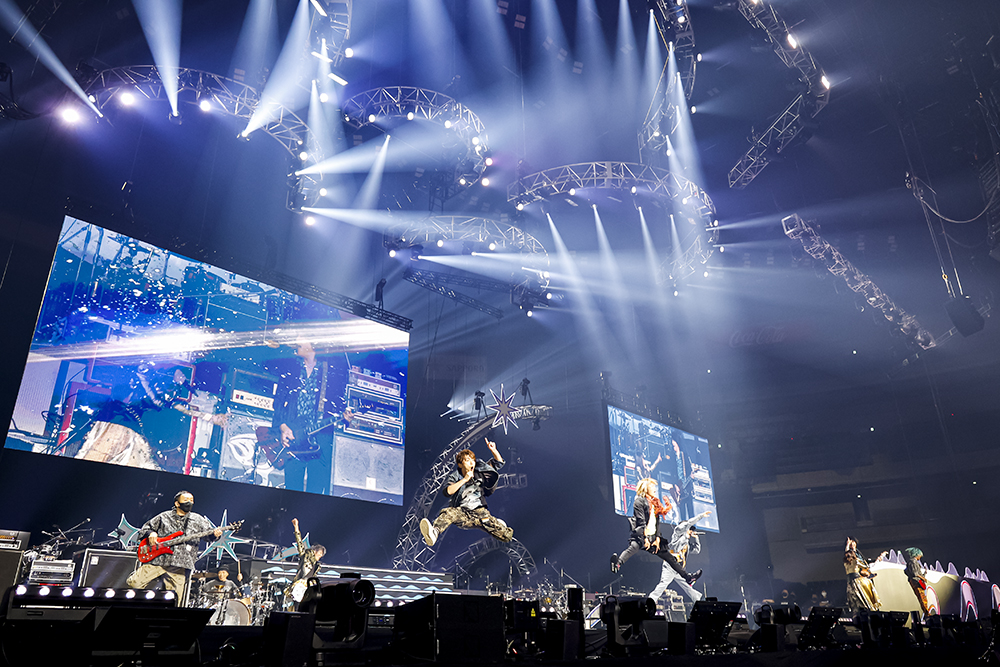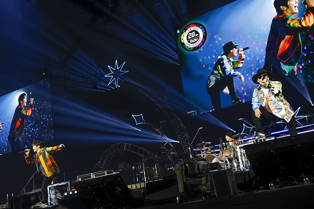「ここにいる全員でGO!」との掛け声から始まるのは、TVアニメ『NARUTO -ナルト-』のOP『GO!!!』。FLOWメンバーも駆け回りながら熱唱する中、観客の盛り上がりは誇張なく会場が揺れるほど。MADKIDもパフォーマンスに参加するなど、お祭り騒ぎのような様相を見せました。
