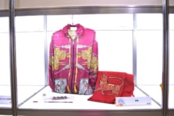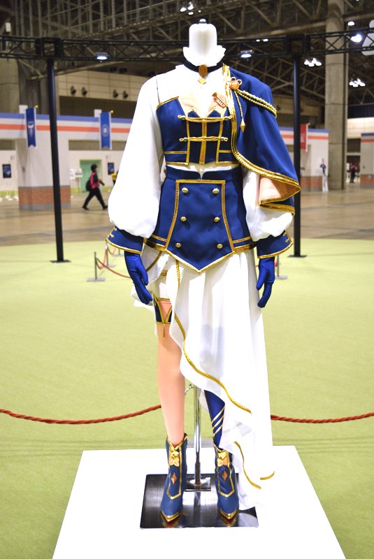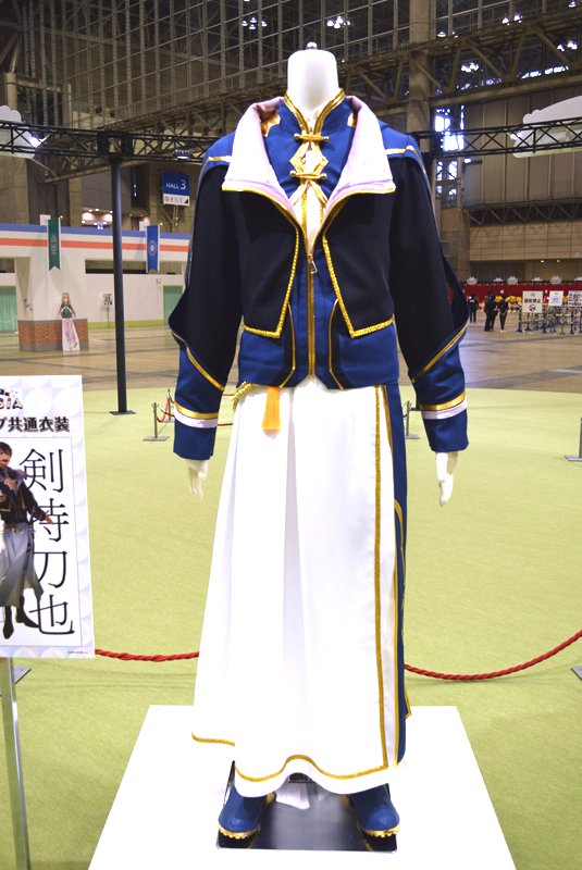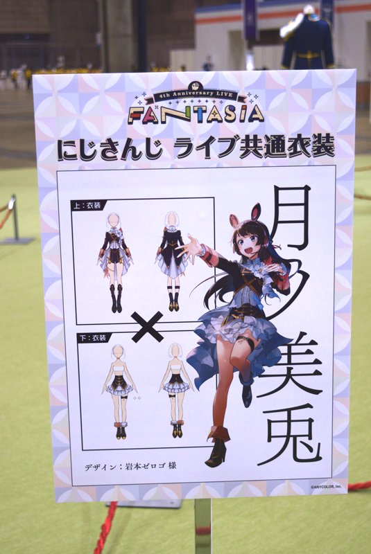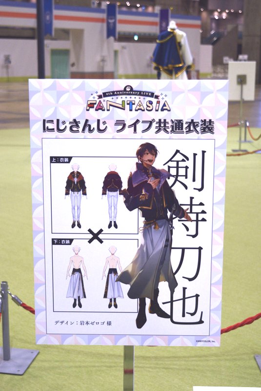 1~3ホールの中央ではFANTASIAの衣装展示を実施! 月ノ美兎、樋口楓、剣持刀也、叶の共通衣装(実物)を見ることができます。イラストによるデザイン図や細かな装飾を間近で見ることができました!