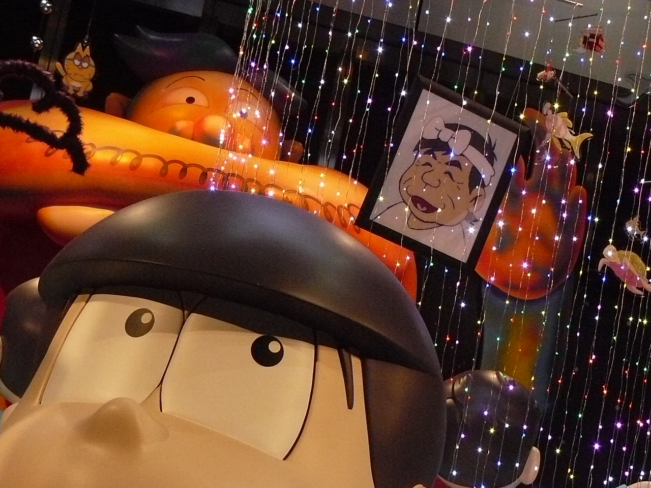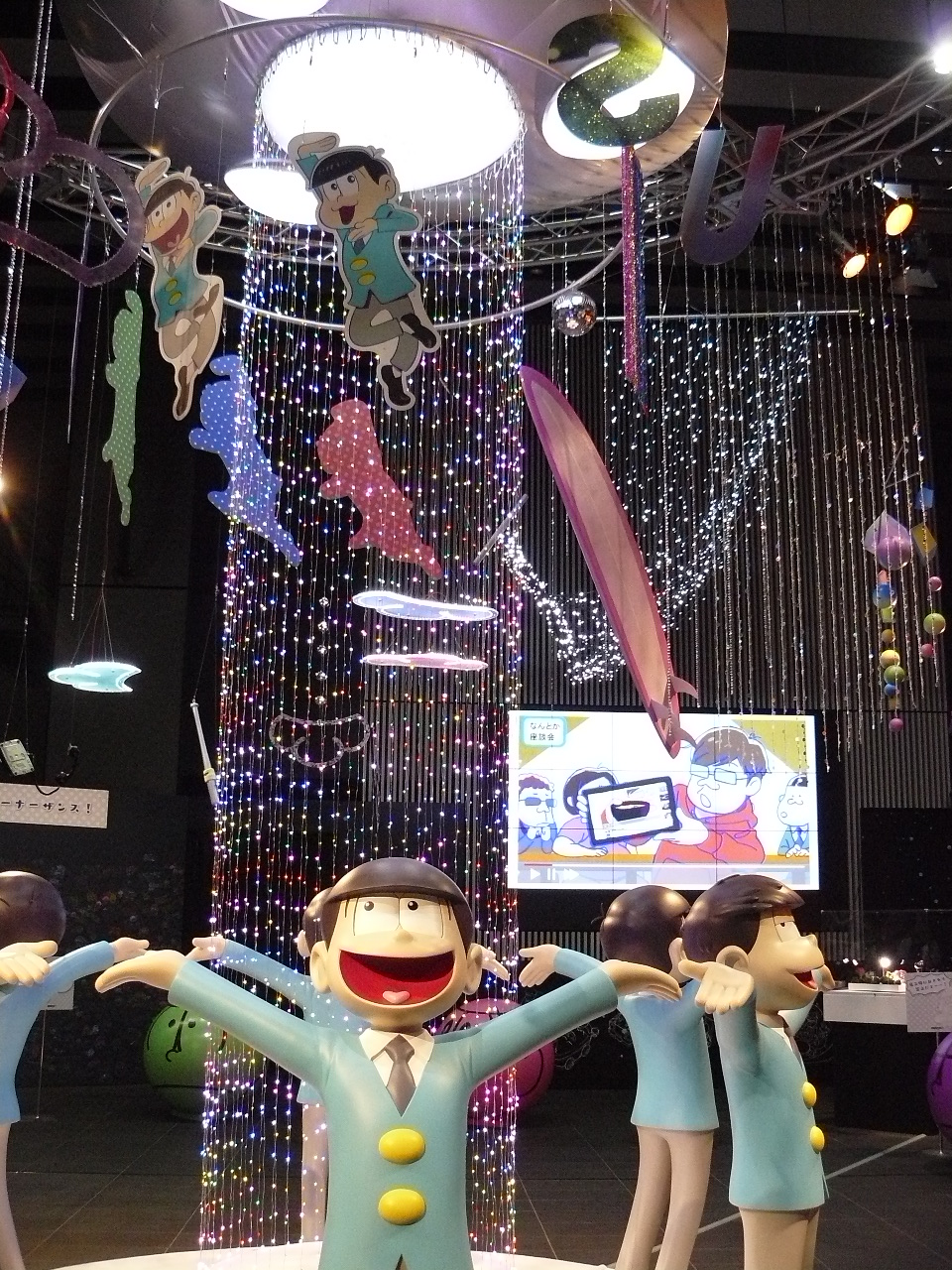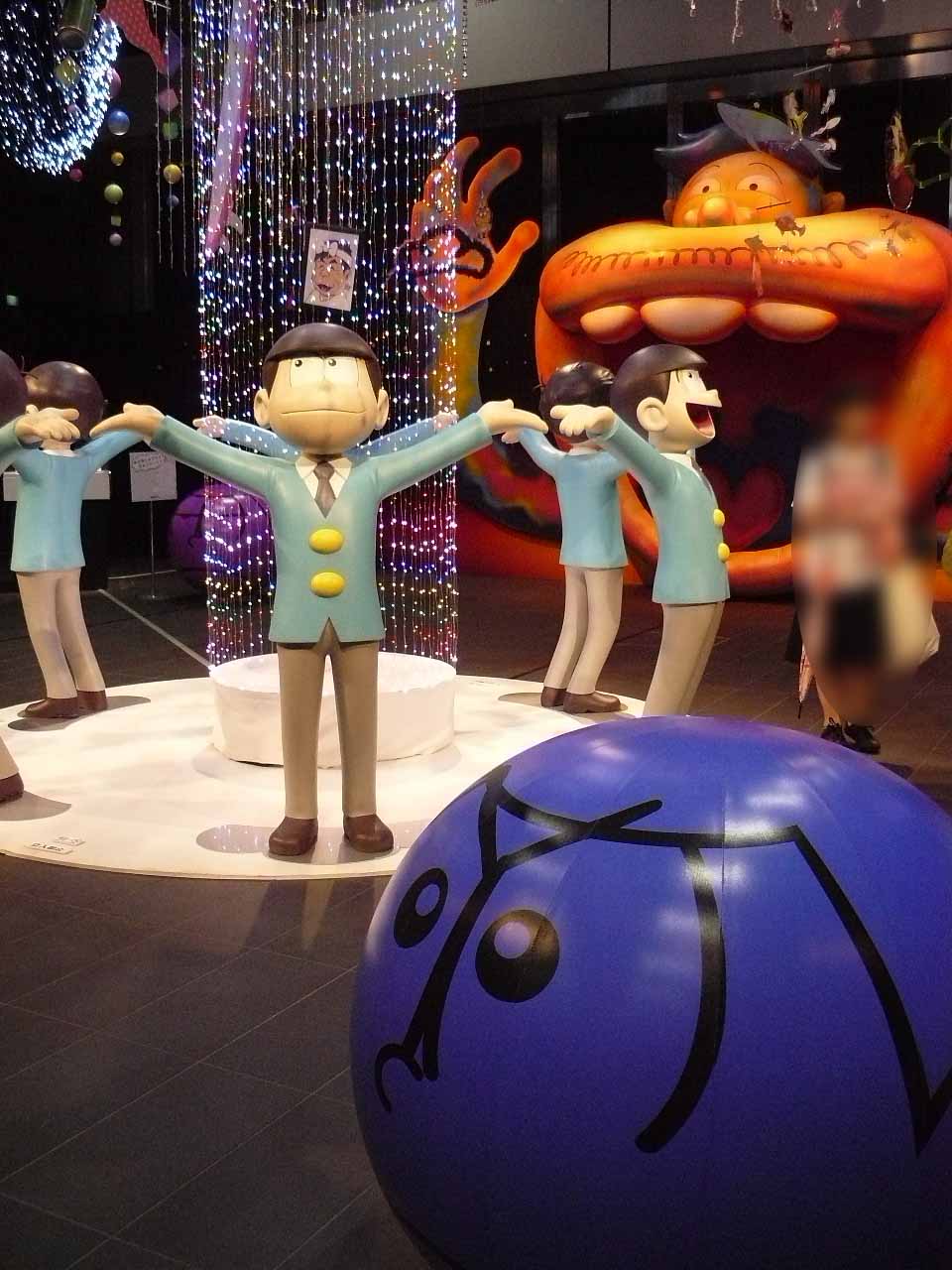第5セクションは会場内で唯一撮影OKのエリア、「松アート」。ここには本イベント最大の目玉となる、『おそ松さん』の世界を立体物などで表現した夢のような世界が広がっています。エリアの中央に浮かぶUFOの真下には、両手を広げる実物大の6つ子たち。その上空には、チョロ松のサイリウムや十四松のバット、松野家のちゃぶ台などなど…ありとあらゆる『おそ松』モチーフのアイテムが浮かんでいました。