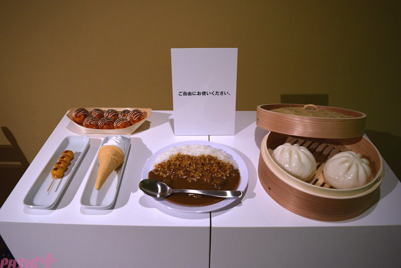 こちらでは、ナガノさんのスケッチブックも展示。作品がどのように出来上がっていくのかをよりリアルに感じられる貴重な資料です。フォトスポットはベンチに座ったナガノのくま、もぐらコロッケ、パグさん。となりにはカレーやたこ焼き、肉まんなどの食べ物が置いてあり、自由に使えるので旅気分を感じる映え写真を撮ってみては?