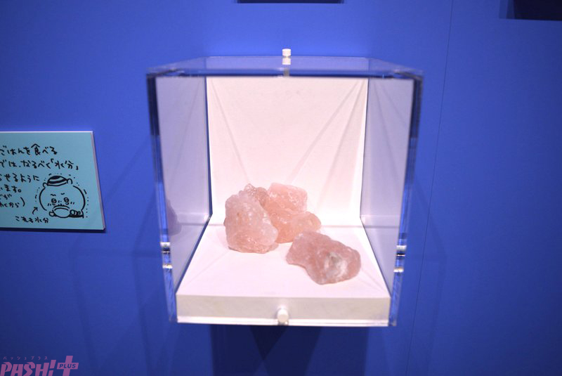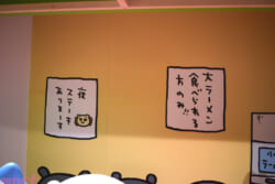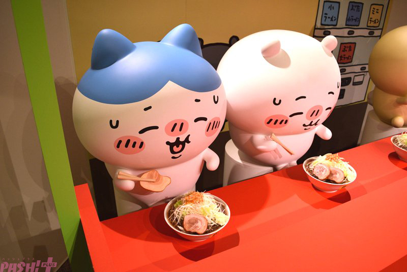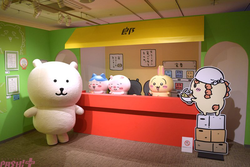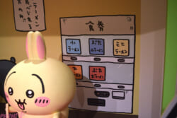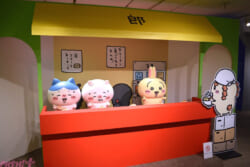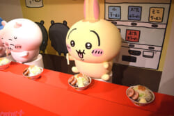 フォトスポットは、ラーメン屋“郎”でラーメンを食べるちいかわたちの他、旅館の拾魔にいたヘビの置物の姿も! 時折目を光らせる他、近くにはピンク色の石も展示されており、該当エピソードを読んだ人をニヤリとさせるとともに戦慄させる力の入った内容となっています。