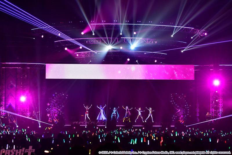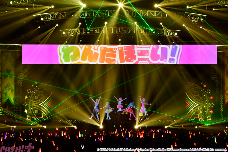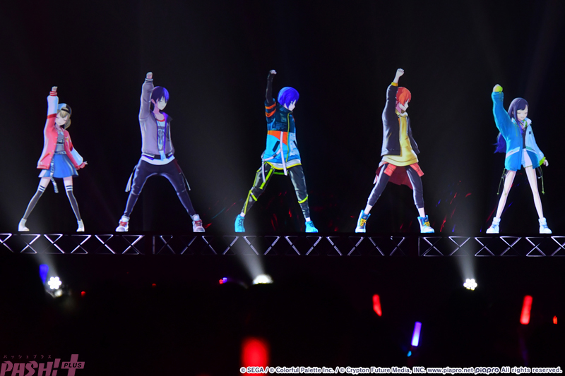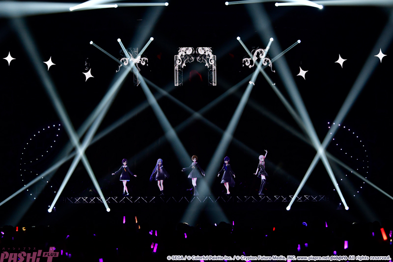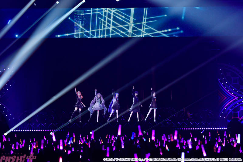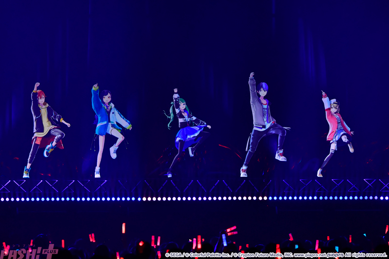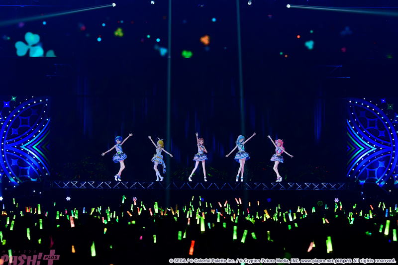 曲のスタートとともに登場して、会場からの歓声にむかえられたのは“MORE MORE JUMP!”のメンバー・花里みのり、桐谷遥、桃井愛莉、日野森雫の4人と初音ミク。ハイテンポなアイドルナンバーをキュートなダンスとともに披露して会場を魅了します。