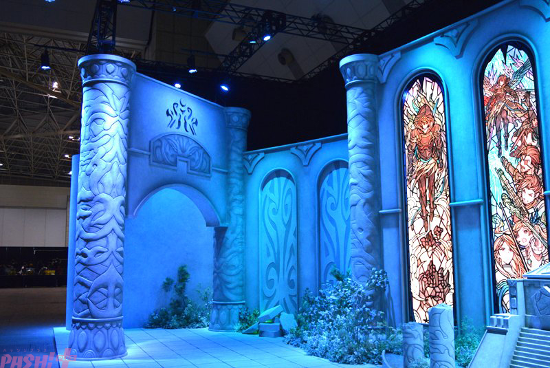 東5、6ホールにはゲーム中のワンシーンを彷彿とさせるコーナーや“カナンの神殿”が展開。東5、6ホールの撮影コーナーには、昨年に行われたガチャピンが登場する“エクスカリバーチャレンジ”で印象深い“エクスカリバー”も用意されていました。また、“カナンの神殿”は荘厳な雰囲気にサンダルフォンのエピソードを思わせるステンドグラスが印象的です。