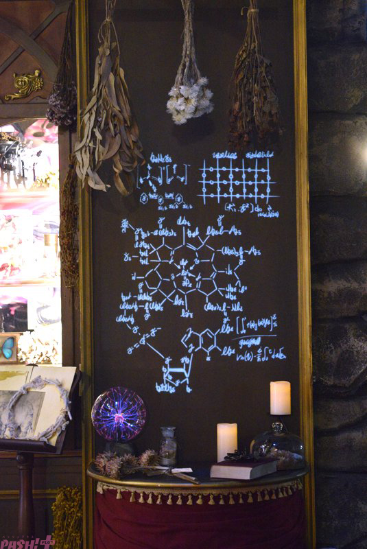 カリオストロが実験に使用している部屋をモチーフにした“カリオストロの錬金実験室”は、カワイイものづくしの装飾だけでなく両サイドにも注目。ビッシリと書き込まれた数式のようなものは、カリオストロの錬金術師としての一面を感じさせます。