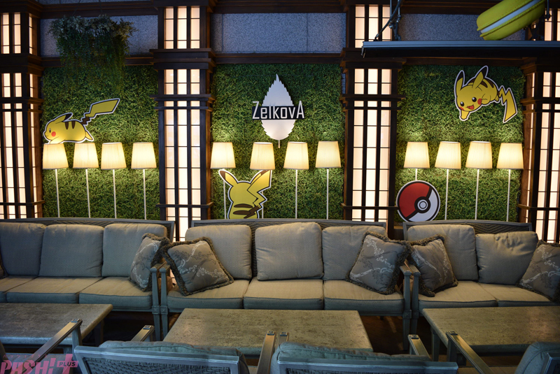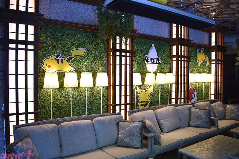 表参道のケヤキ並木から続くロビーに、緑の木洩れ陽が差し込むテラスが印象的な”カフェ&ダイニング ゼルコヴァ”では、一部座席にてピカチュウの装飾が展開。