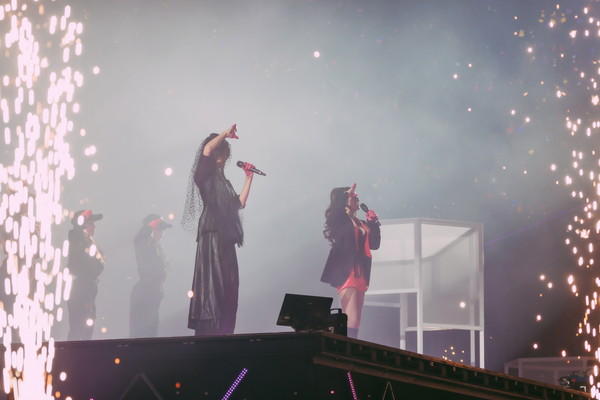 ここでモニターに中王区のロゴが。ピンクの光とスモークに包まれて登場したのは、東方天乙統女役の小林ゆう、勘解由小路無花果役のたかはし智秋。まずは「Femme Fatale」で一気に世界観に引き込むと、小林が「Just do it」、たかはしが「No Pain, Not to be Strong」を披露。そして2人揃っての「Verbal Justice」と続いていく。この4曲の中にセクシーさも、美しさも、クールさもすべて詰まっていたと言っても過言ではないだろう。続いて登場したのは伝説のチーム「The Dirty Dawg」。今日イチの歓声の中、飛び出したのは圧巻の「T.D.D LEGEND」であった。