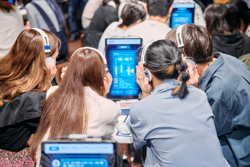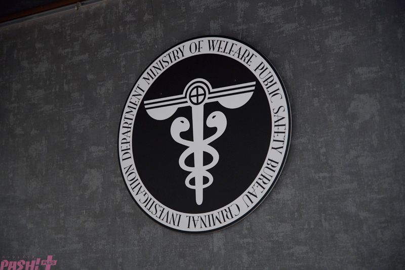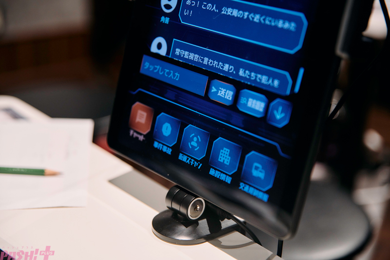 “『PSYCHO-PASS サイコパス』の世界に来た!”と思わせてくれるようなスタッフさんの立ち居振る舞いに背筋を伸ばしながら会場に入ると、壁面には公安局のエンブレムが! また、会場内には大きなスクリーンや捜査中に先輩監視官・執行官と連絡を取るための端末が設置されており、作品の雰囲気をひしひしと感じられます。