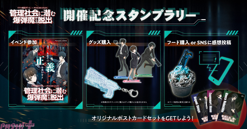 その他、公演にあわせたキャンペーンも展開。イベント参加者全員に“ドミネーター照準風クリアフォトフレームカード”が配布される他、常守・狡噛・宜野座の3名のオリジナルポストカードセットがもらえるスタンプラリーが実施されます。さらに、購入特典付きのオリジナルグッズ&フード販売も行われます。
