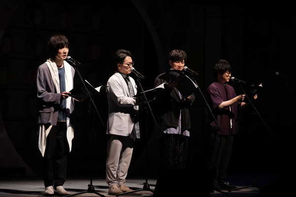 白熱したミニゲームの後は、ふたたび朗読劇へ。書き下ろしの物語をキャスト14名全員で披露し、三日月宗近と豊前江のやりとりに笑いが起こったと思うと、千代金丸たちの優しい歌声に聞き入ったり、雨上がりに桜の木の下で全員で写真撮影を行うなど、「花丸」らしいほのぼのとした温かい日常の物語を会場中も存分に楽しんでおり、キャスト陣の熱演に温かい拍手が沸き起こりました。