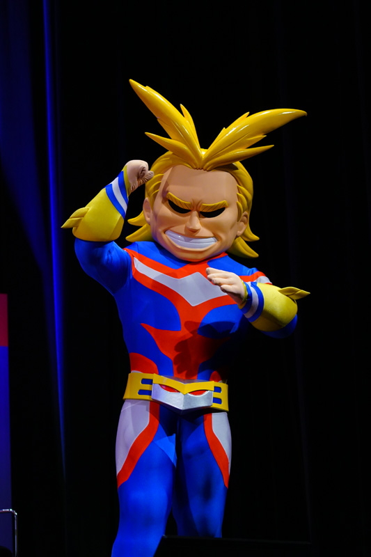 ゲームに勝利したのは、諏訪部さん率いるイレイザーヘッドチーム。ここで勝利チームに豪華賞品を渡すべく、本作の“宣伝ヒーロー”オールマイトくんが参上! 会場を沸かせていました。