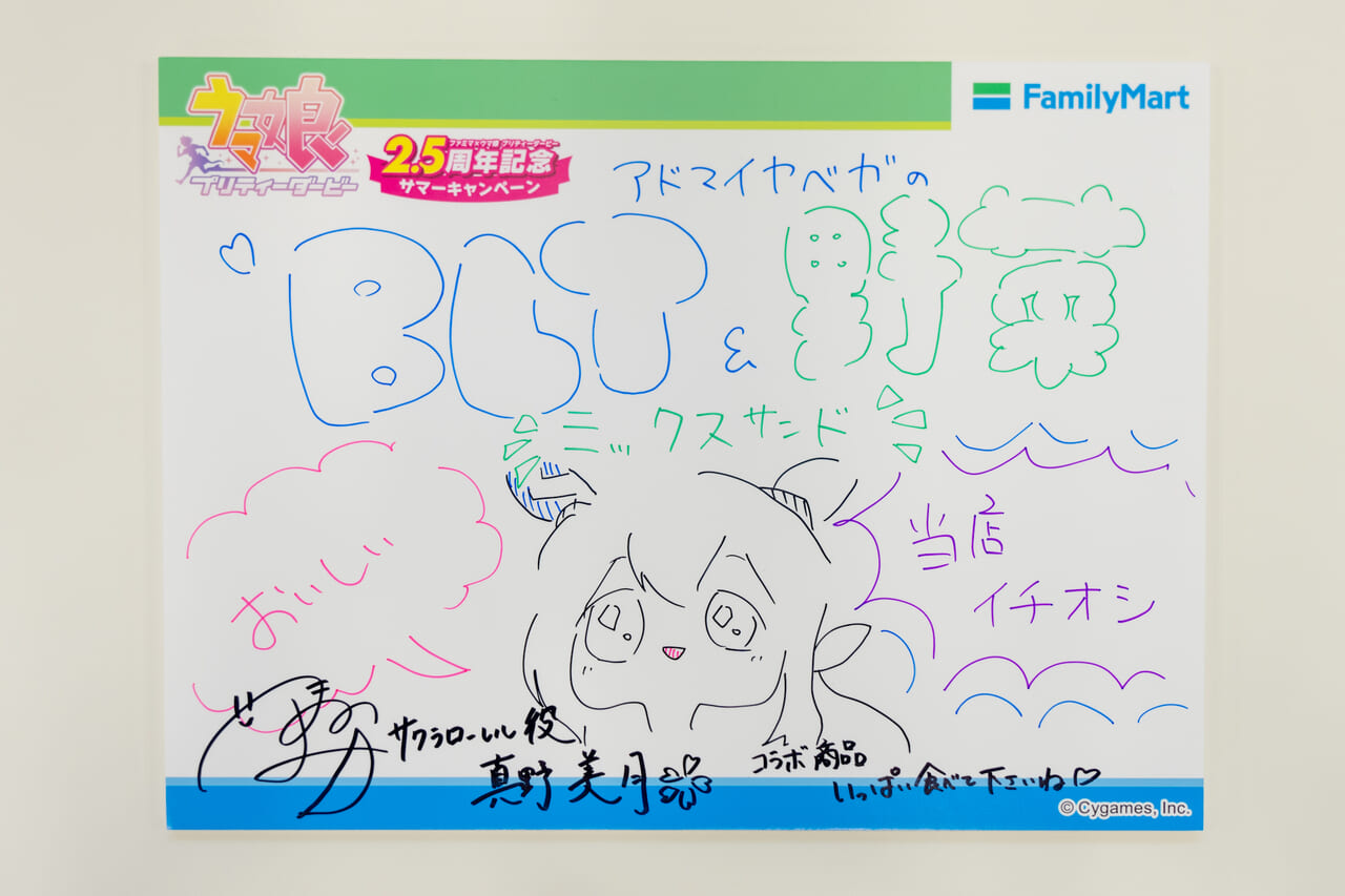 食レポのあとに行われたコラボ商品をアピールする「コラボ商品アピール手描きPOPお絵描き対決!」では真野さんは「アドマイヤベガのBLT&野菜ミックスサンド」、春川さんは「ライスシャワーのはちみつパン」の魅力を伝えるカラフルなPOPをその場で描いていきました。イラストが得意のおふたりの対決ということで、おふたりともに可愛らしいウマ娘のイラストが描かれていました!