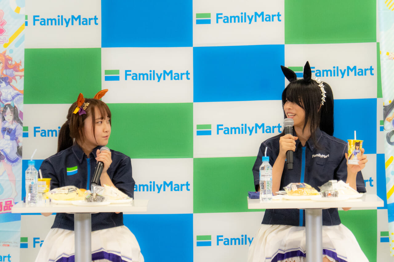 ファミリーマート×『ウマ娘 プリティーダービー』2.5周年サマーキャンペーンのメディア向け発表会が開催され、『ウマ娘』でサクラローレル役・真野美月さんとシンボリクリスエス役・春川芽生さんがトレセンの制服の衣装にファミリーマートの制服を合わせたコラボレーション衣装で登場し食レポや手書きPOP対決などでコラボ商品とPRしました。