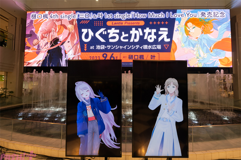 2日目は『Lantis Presents ひぐちとかなえ at 池袋・サンシャインシティ 噴水広場』ということで、樋口と同じにじさんじ所属のバーチャルライバーで、Lantisに所属してアーティスト活動も行う叶との合同リリースイベントに。まずは前日と同様、樋口が大型ビジョンに登場し、ディスコ調の華やかな「イロドレ・ファッショニスタ!」からライブをスタート。