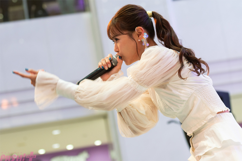 前日のイベントで「ダンスは苦手」と話していたが、サビで振りを踊りながら歌う姿は様になっているし、観ているこちら側も楽しくなる。噴水の演出も相まって、派手なオープニングとなった。その後のMCで「市場調査」と称して、会場に駆け付けた観客にどこから来たかのアンケート(「関東」と「関東以外」)を取ってコミュニケーションすると、続いて「ビューティーMYジンセイ!」と「ぶっ飛んでラニカイ」の2曲を連続で披露。