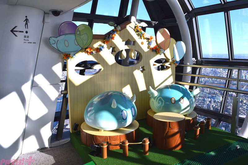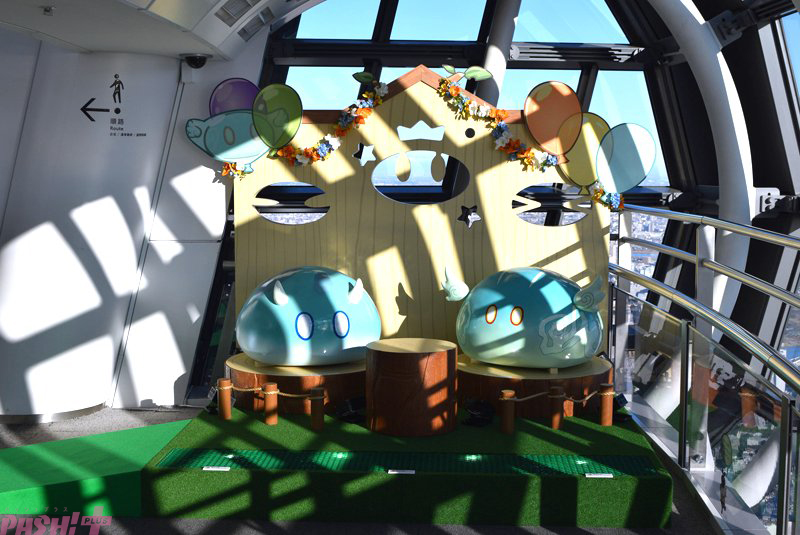 約110メートルの回廊エリアでは、『原神』の世界やキャラクターたちを紹介するギャラリーが展開。左には『原神』の世界観、右には東京スカイツリーからの絶景が広がる絶景です。推しキャラの前で写真を撮るのもオススメ! また、回廊の終端部となる折り返しエリアには、かわいいスライムたちと写真を撮影できるフォトスポットも展開しています。