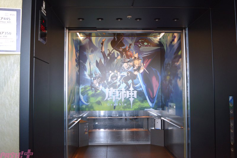 地上350メートルの天望デッキではイベントコラボで描きおろされたちびキャラたちや遺跡守衛たちの装飾が展開。また、地上350メートルの天望デッキから天望回廊に向かうエレベーターは『原神』のキービジュアルイラストを使用した装飾が施されています。移動中はエレベーター内のディスプレイに流れる映像も!