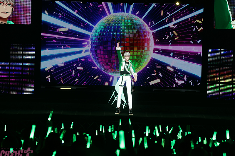暗転したまま、リボンを緑に光らせ不敵にクラップを要求するのはチャキチャキのイタリア人・アルランディスだ。コーレスが楽しい人気曲「W.I.M.」を、満を持して声出しありで披露。ファミリアランは両手のペンライトで三角形をつくり、全力の「アランさんカッケー!」を贈る。筋トレ仕込みの圧倒的な肺活量による目まぐるしいラップ詞、そしてライブならではの重低音が体にビリビリくる感覚が気持ち良い。