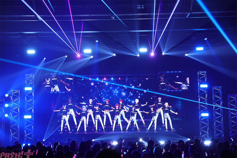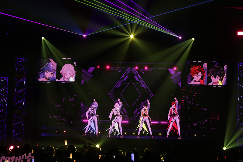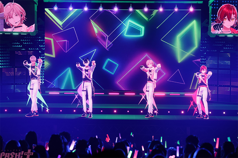 暗転中、メンバーカラーリボンが重なって見えたことに一瞬どよめけば、一列に並んだunplanが登場。みやび、アルランディス、律可、シエンの4人が属する、昨年結成されたセルフプロデュースのユニットだ。大食い企画や世界記録チャレンジなど体当たり系の活動も多い彼らだが、今日はオリジナル曲「superior stars」でクールな魅力を存分に発揮した。