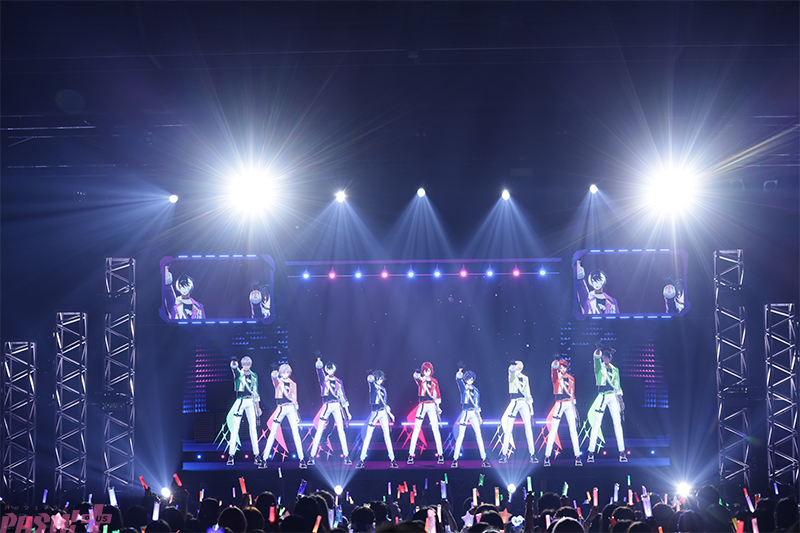ハスキーからハイトーンまでカラフルな男性合唱が響きわたり、各メンバーカラーのビッグリボンが色鮮やかにきらめく様子はまさしく万華鏡。時折混ざるホロスタ民のコールには、声出しできなかった前回・前々回のライブへの思いもこもっている。三度目のライブにしてようやく声援を浴びる彼らの姿を見られて、はやくも万感胸に迫った。