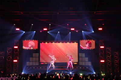 シエンはそのままステージに残り、3期生メンバー・魔フィアでMCパートを担当。歓声を浴びて跳ね回ったり、観客と「愛してる」のコーレスをするはずが二人の世界に入ってしまったりとやりたい放題。ペンライトの切り替えを活かしたミニゲームも楽しんだ。