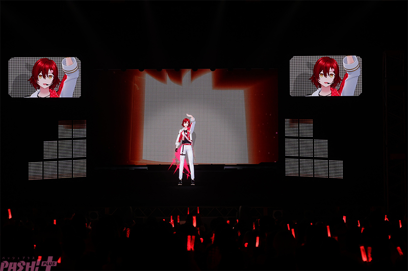 このままUPROAR!!メンバーが続くかと思いきや、2期生の夕刻ロベルが登場し、流れ出すのは「POP-TALK」のイントロ。「おしゃべりモンスター」と称される通り普段は軽妙な雑談配信が人気のロベルだが、ライブでは甘い歌声で誰よりもアイドルになる。終始満面の笑顔で振り付けをこなし、「みんなの声聞かせてやー!」と声出しをリードしてみせた。