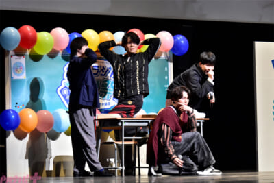 カメラマンとしても活動する駒田さんは“写真部”を選択。本コーナーでは、お題に沿ったものを20秒以内に撮影していくという、一見簡単に見えて難しい企画が用意されています。撮影役に名乗り出たのは駒田さん……ではなく、文化祭実行委員の三上さん。悪の四天王、喧嘩を止める人、友達の告白を影から見守る光景を一生懸命再現する出演者たちの姿には思わず熱狂する観客も現れました。