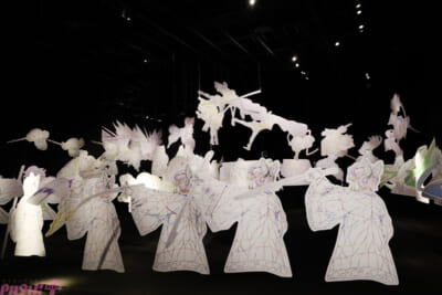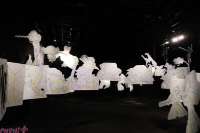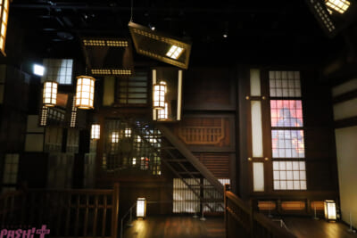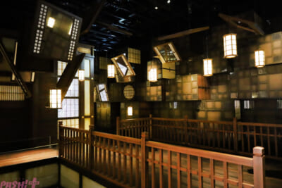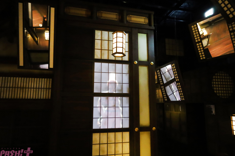 映像演出から進むと、不気味な無限城の一角が再現されており、鬼のような影や落下する鬼殺隊の隊士たちの悲鳴が。恐ろしさを感じつつも、これからの無限城編の展開に期待が高まる展示となっていました。