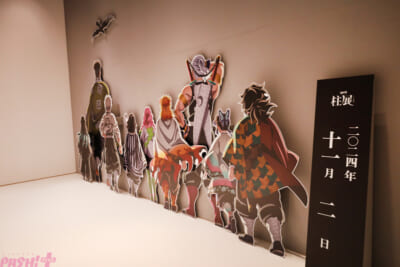 「柱ー身体」では柱たちの等身大グラフィックと各種資料によって再現された日輪刀の柄部分、「柱ー言葉」では柱札による彼らの言葉を再生できる音声コンテンツによって彼らの魅力をより身近に感じることができます。展示空間には様々な言葉を書き記したボードを見ることができ、視覚的にも楽しい空間です。