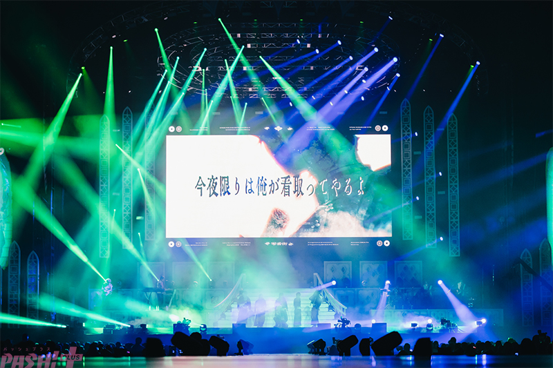 このパートについて、2日目はいれいすの音楽の世界観を拡張させた、スリリングでアンダーグラウンドな楽曲群が用意された。「Paparazzi」では椅子に座って、サングラス姿の初兎が「親愛なるアンチの皆様。いれいす、ベルーナまで来たぞ!」と不敵な挨拶。続く「百鬼夜行」は、「吉原ラメント」で知られる亜沙が手掛けた曲。メンバーは花道を練り歩きながら、カメラに順番にファンサービス。このパートはカメラワークも計算され尽くしていて、全員がぎゅっと集合してのサビは迫力も破壊力もバツグンだった。FAKE TYPE.が書き下ろした「Place to be」でさらに狂気度を高めると、「零番街」で蠱惑的なステージングを展開した。