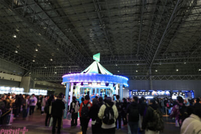 会場に入ると、まずは大きなクレーンゲームを模した「エントランスゲート」が広がり、入場前の期待感が高まります。エントランスを抜けると、メリーゴーランドのモニュメントがお出迎え。20分毎に光と音の演出と共にメリーゴーランドが回転する姿に、来場者の目はくぎ付けになりました。