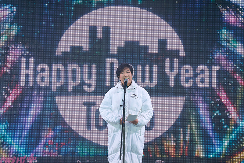 いよいよ新年まであと10分を切ったところで、小池百合子 東京都知事が登壇。「みなさんこんばんは!東京都知事の小池百合子です。Happy New Year Tokyo 2026 に寒い中お越しいただきましてありがとうございます。日本を代表するアーティストのみなさん素晴らしかったですね。東京の伝統と革新。それを象徴するかのようなパフォーマンスを見せていただきました。今年東京は、サウジアラビアの TOURISE AWARDS とアメリカの旅行雑誌の読者投票で、世界一の観光地として認められたところでございます。そして、世界の都市ランキングでも、3位から2位にランクアップしました。今日ご覧いただいている、都庁舎のプロジェクションマッピングは、これまでに110万人以上がご覧いただいています。東京のナイトタイムの魅力を確実に高めてくれています。世界で1番の都市を目指している東京の魅力を、さらに磨き上げていきたいと思います。さあ今年も残り数分となりました。みなさんと一年を締め括って、希望に満ちた新たな一年を迎えたいと思います」と、来場者へ向けて新年の希望を込めた挨拶が行われました。