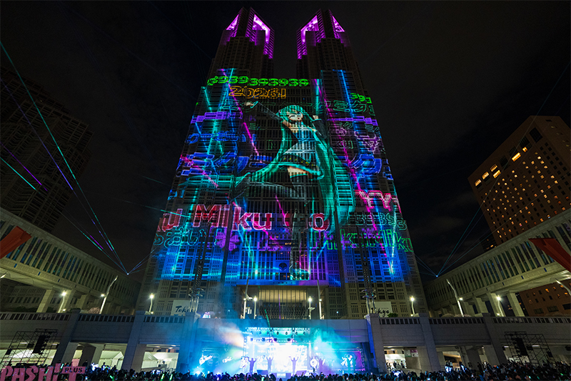 続いて登場したのは、バーチャルシンガーの初音ミク。「最先端イマーシブライブ」として史上最大の初音ミクが都庁舎に投影され、プロジェクションされたミク自身の指からレーザーが飛び出した瞬間は、まさに現実とバーチャルが溶け合う異次元の演出で、デジタル都市・東京を象徴する一幕となりました。