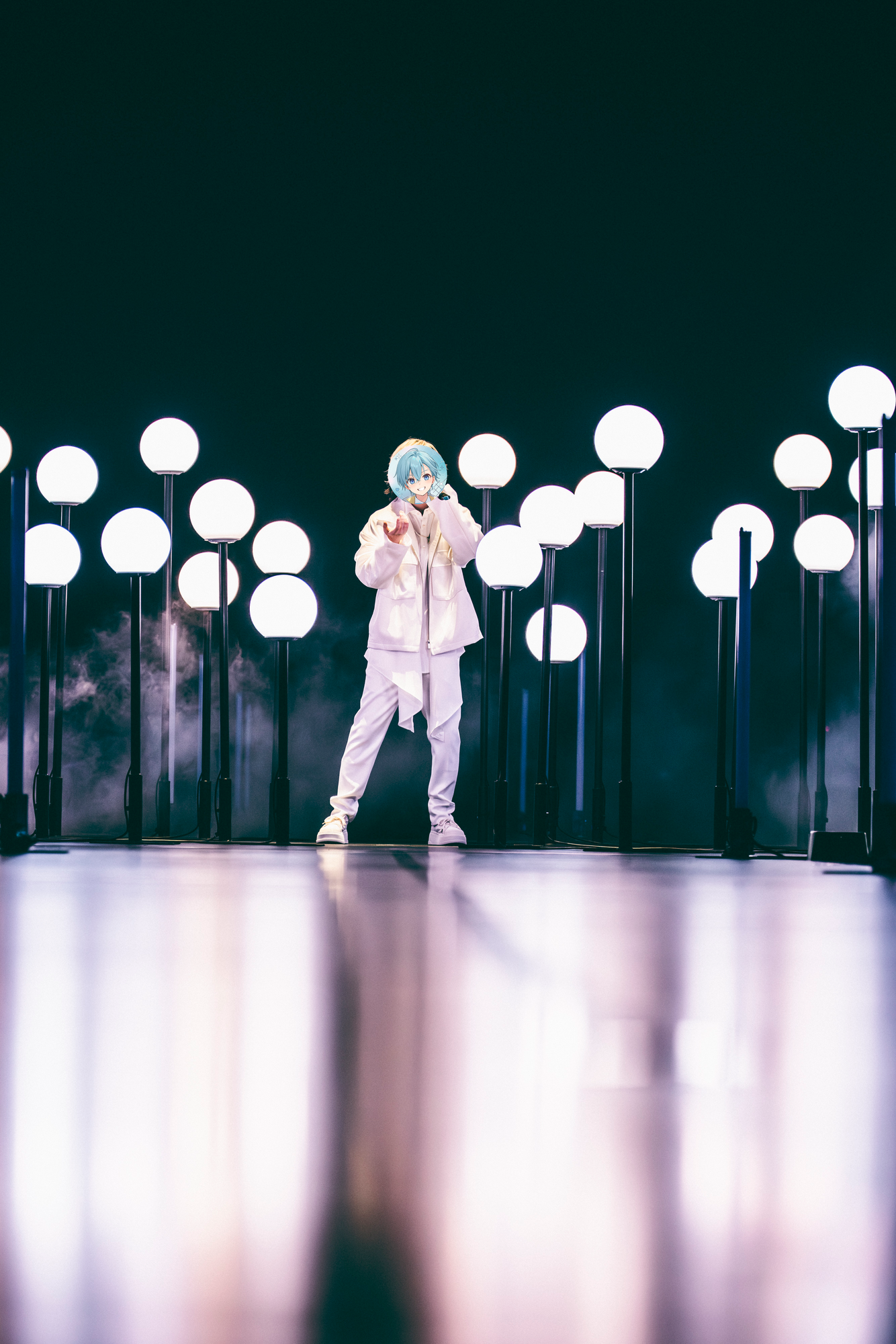 穏やかでアンバーな光を放つ球体ランプに囲まれ花道で揺蕩うようにていねいに歌声を響かせた「心像」。一転、球体ランプがカラフルに光り、ダンサーと軽やかに楽しげに歌って踊ってTikTok風映像演出でも盛り上げた「チョロすぎ?」。『空色エンドロール』という作品の幅と奥行きを感じさせたあとは、ころんがブルーとシルバーのラメが光るショートジャケットを羽織り、DJタイムへ突入。