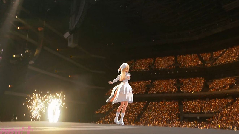 次の11曲目で不知火フレアが「架空と本当」を披露した。実はここで、とある夢がひとつ叶えられている。この曲のMVが公開されたとき、不知火フレアは歌詞の「さぁ 眩むような光でも 見えるように振ってみて 道導の灯台のように」というフレーズにかけて「いつかライブで歌えたら道導の灯台のようにサイリウムを振ってほしいな・・・!」というコメントをしていたことがあるのだ。