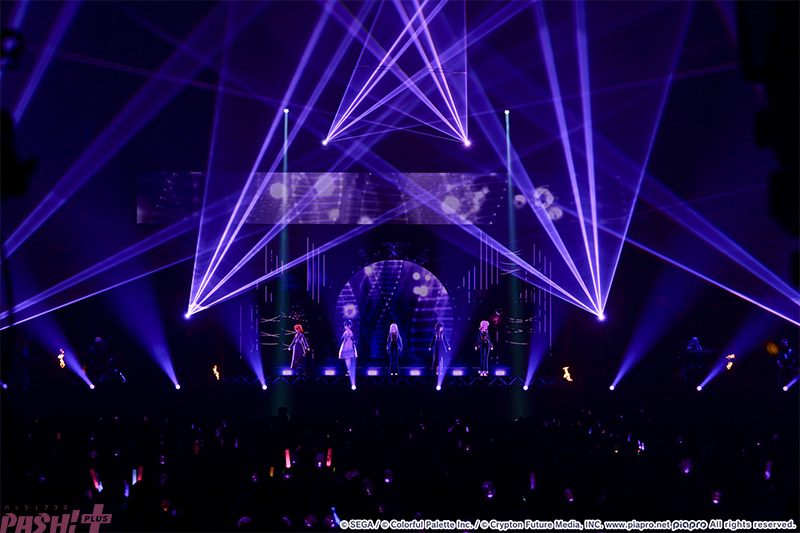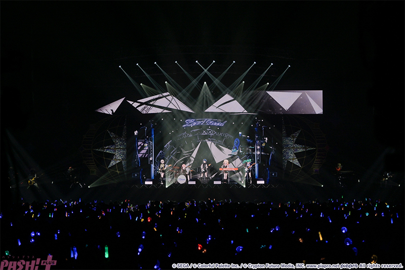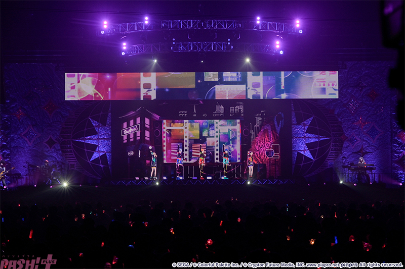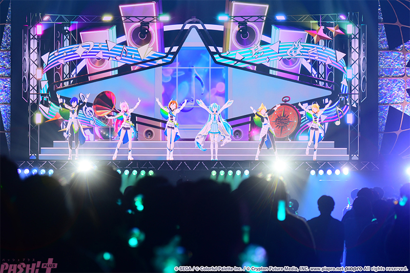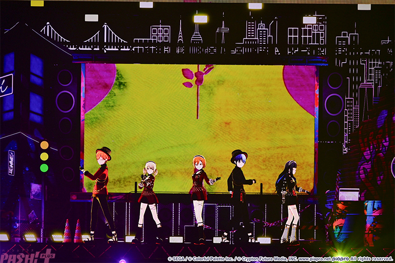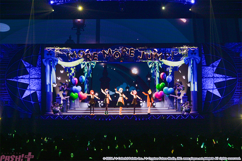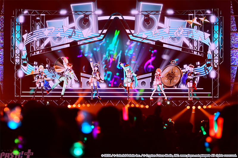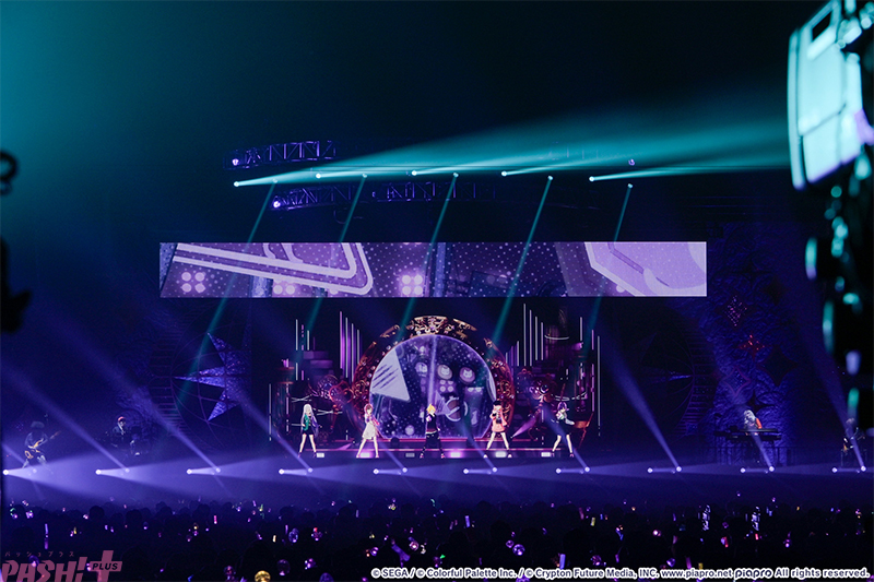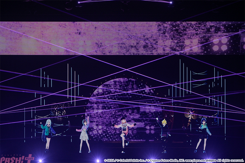5つのユニットが最初の出番を終えたところで姿を見せたのはバーチャル・シンガー(初音ミク、鏡音リン、鏡音レン、巡音ルカ、MEIKO、KAITO)たち。ここまでのライブを振り返ると、学生服風の衣装に姿を変えて『Be The MUSIC!』を歌唱します。