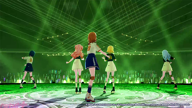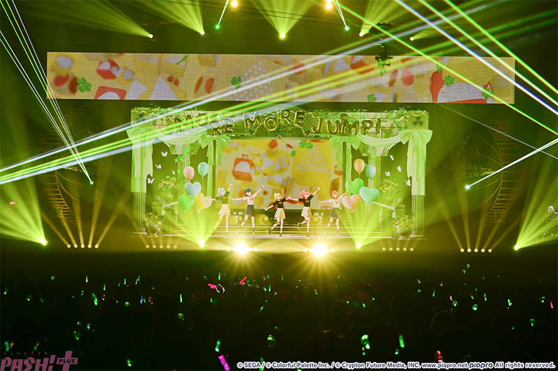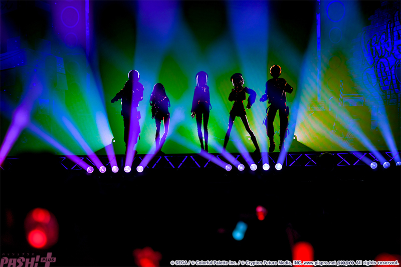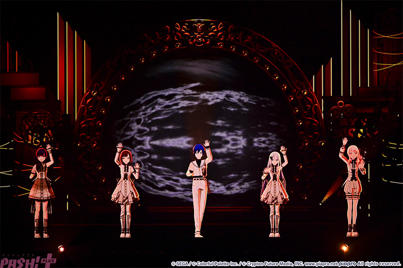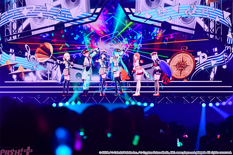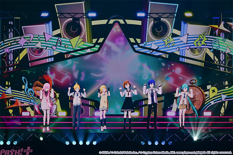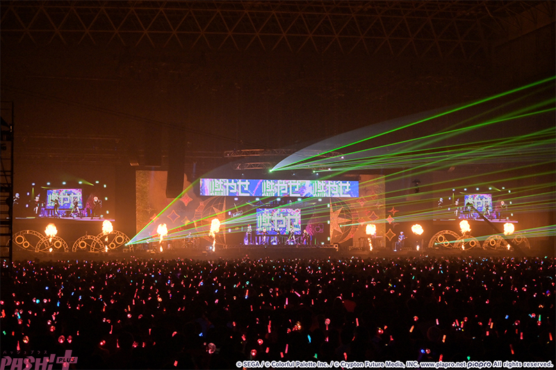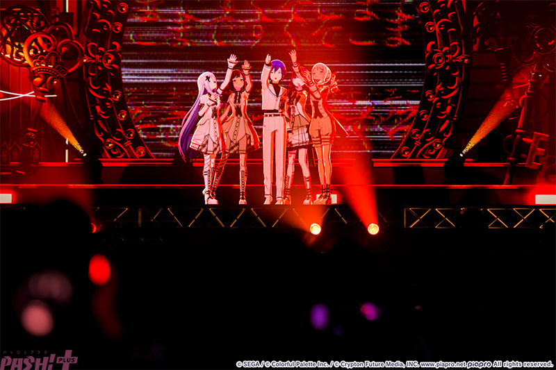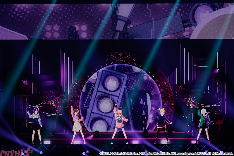 5つのユニットが最初の出番を終えたところで姿を見せたのはバーチャル・シンガー(初音ミク、鏡音リン、鏡音レン、巡音ルカ、MEIKO、KAITO)たち。ここまでのライブを振り返ると、学生服風の衣装に姿を変えて『Be The MUSIC!』を歌唱します。