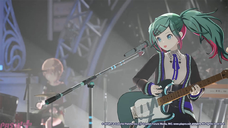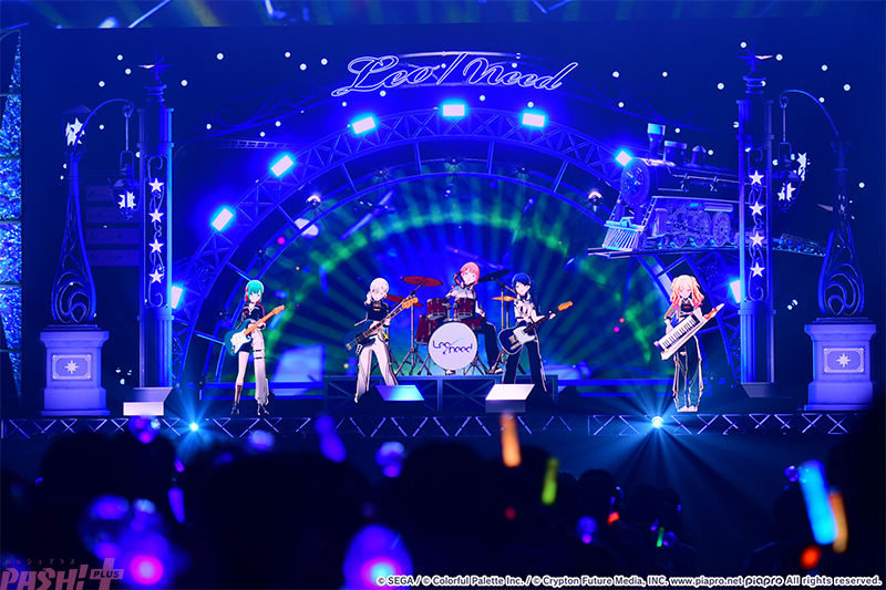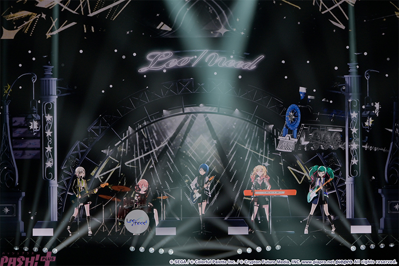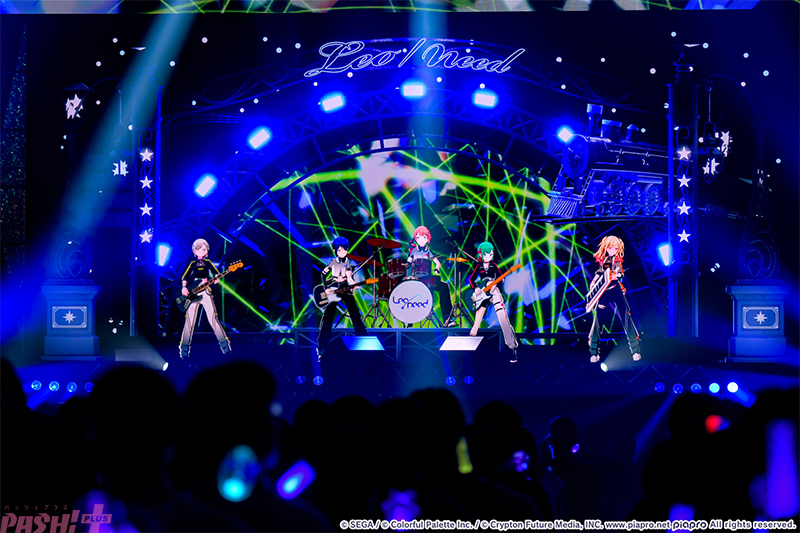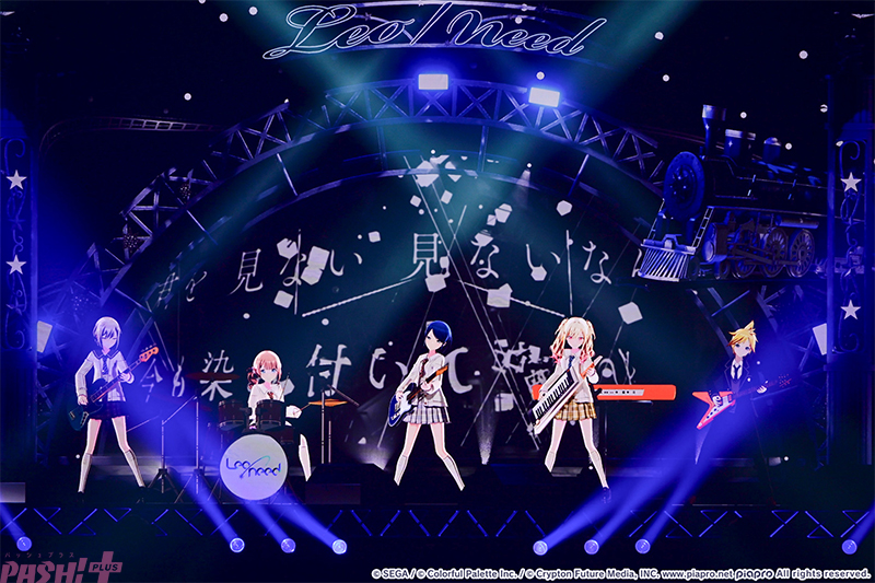 静寂の中からバンドサウンドで『てらてら』をスタートさせたレオニメンバーとミクの姿に観客からは歓喜の声が! クールな衣装と演奏する姿に反した熱い歌声とリリックが、終盤に向けて会場のボルテージを上げていきます。
