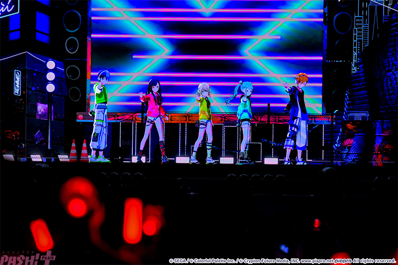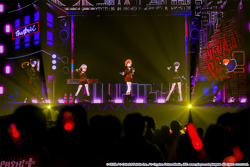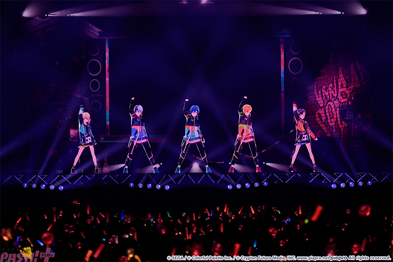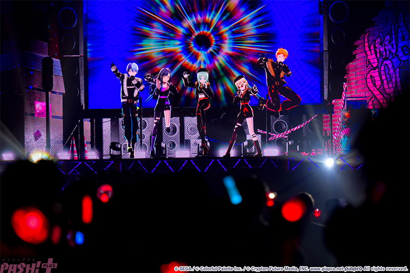 疾走感あふれる『リアライズ』とともにステージに姿を見せたのはVivid BAD SQUAD(通称:ビビバス/小豆沢こはね、白石杏、東雲彰人、青柳冬弥)と初音ミク! 冬弥の「ギアを上げていくぞ!」の言葉通り、開幕からトップギアと言わんばかりの激しいダンスパフォーマンスを見せ、会場も彼らに応えるようなクラップとコール&レスポンスで一体になって盛り上がります。