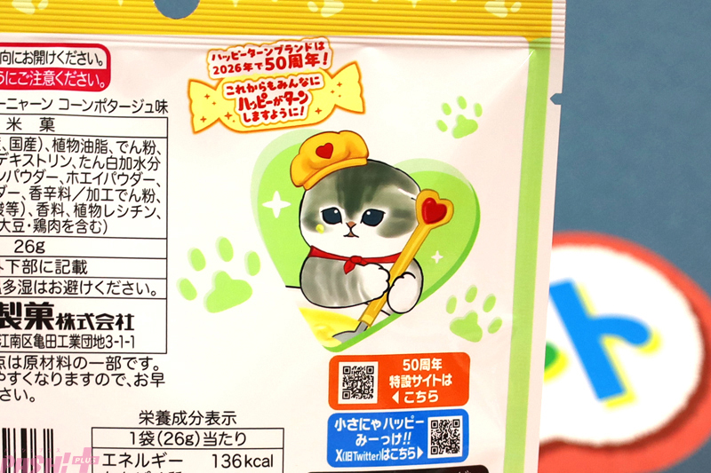 ハッピーターン、ハイチュウ、忍者めし鋼の定番のお菓子がかわいい『mofusand』コラボパッケージで登場! 『ハッピーニャーン』はつながるデザインのパッケージ、『ニャン者めし鋼 ピーチ味』はにゃんこ型と肉球型の2種類のグミに注目です。裏までかわいいパッケージなので、店舗で見つけた際は要チェック!