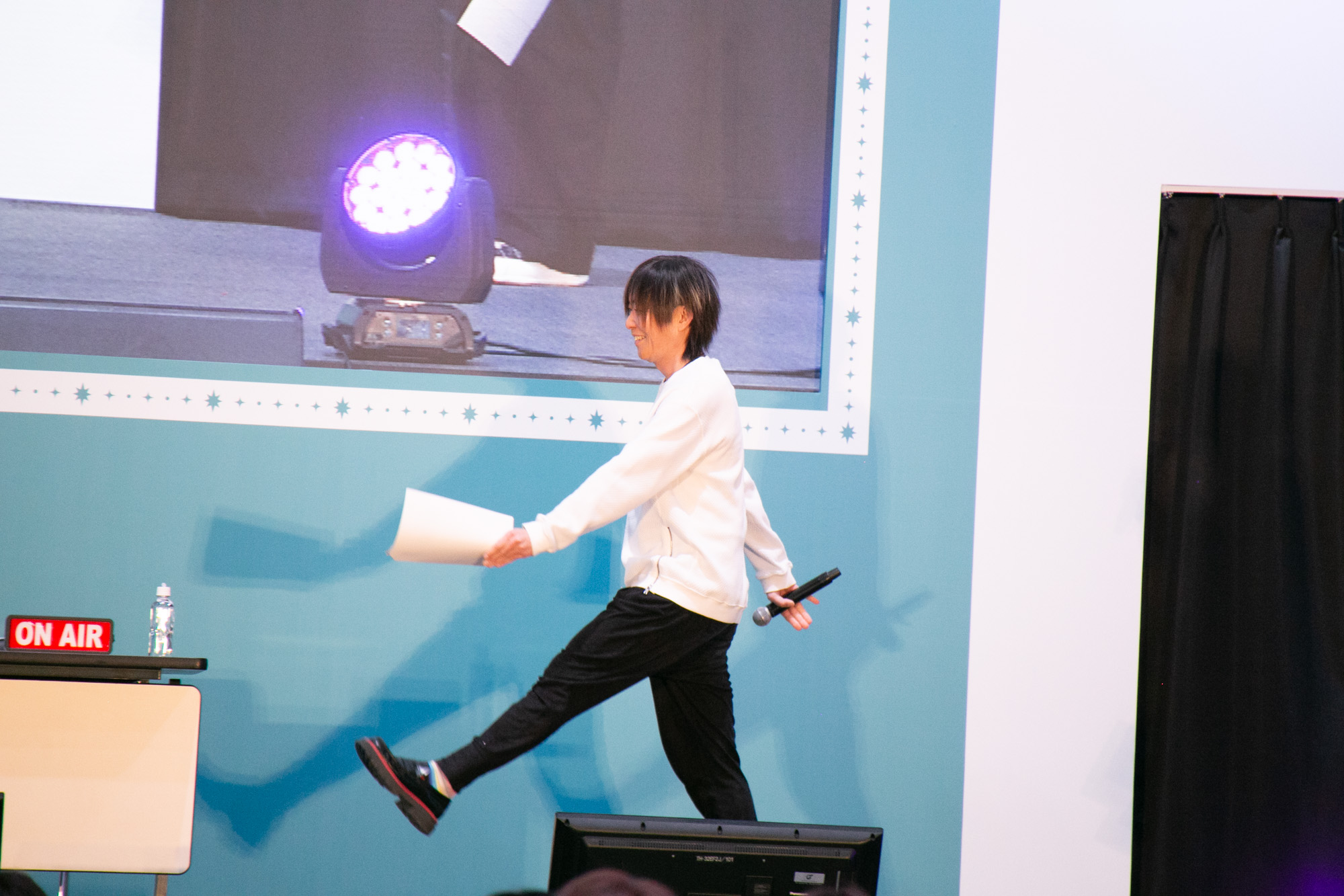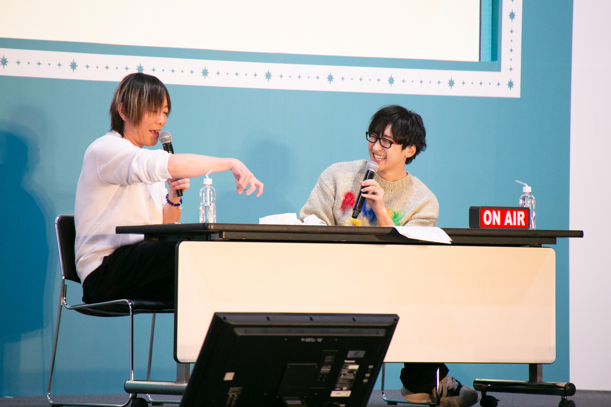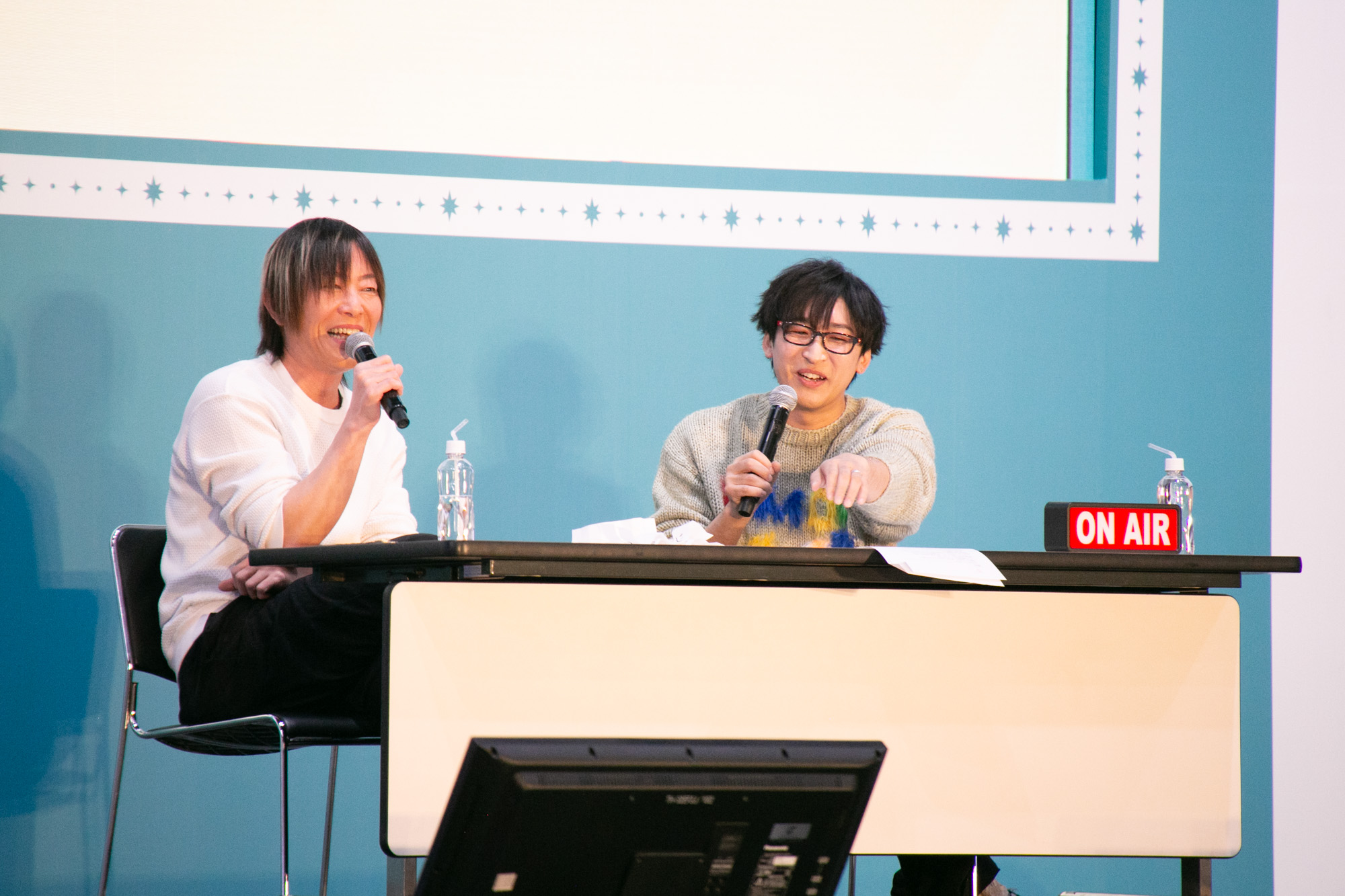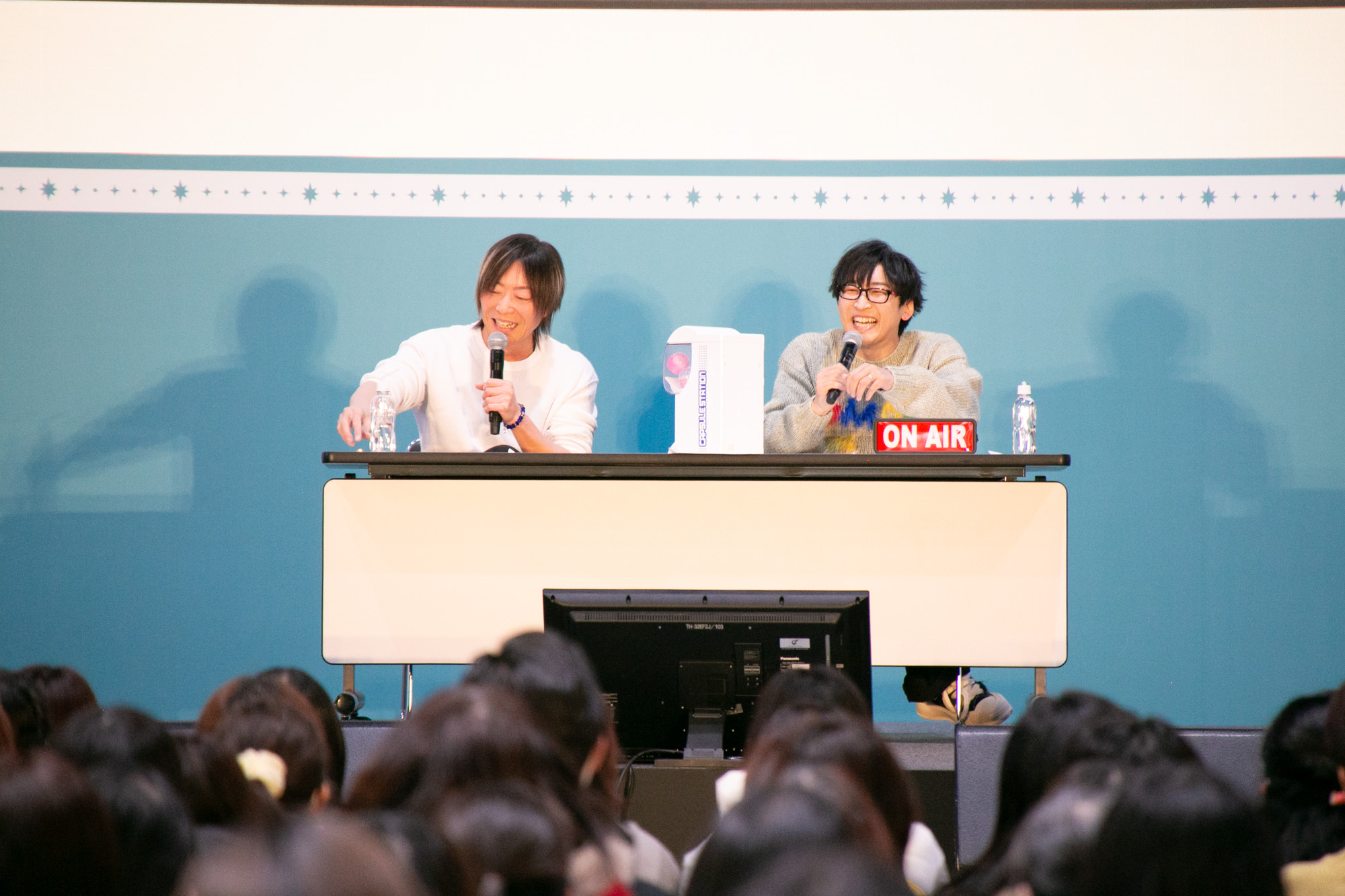 最後にもう一度、谷山がガチャポンマシーンを回し、「5歳児」というお題と、「とびきりのイケボで」というお題のふたつを組み合わせてチャレンジすることに。あどけない口調×イケメンボイスという未知の組み合わせに、谷山がひと言喋るたびに客席からは笑いが巻き起こり、読み終えたあと、谷山は照れて顔を隠していた。読み上げたメールは、転職活動中のリスナーからの「面接の緊張を緩和するコツを教えてほしい」というリクエスト。寺島は「今の谷山さんを思い出して、笑顔になって、心穏やかに臨めば怖いものなんてないです!」とエールを送っていた。