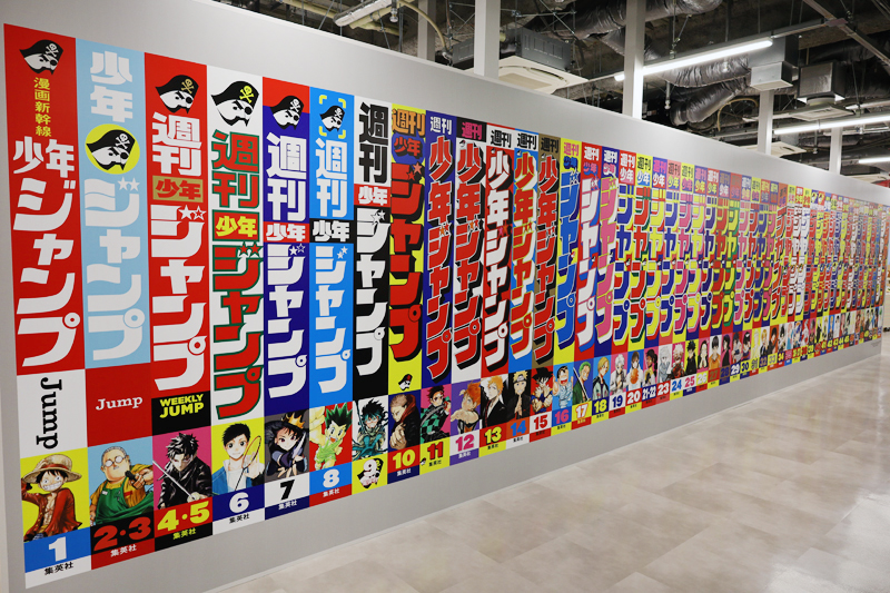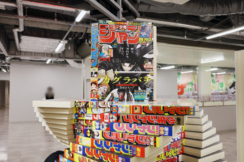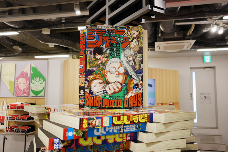 店内に入ると、天井から吊り下げた店舗ロゴと歴代の「週刊少年ジャンプ」本誌を模して積み上げた巨大オブジェがお出迎え!