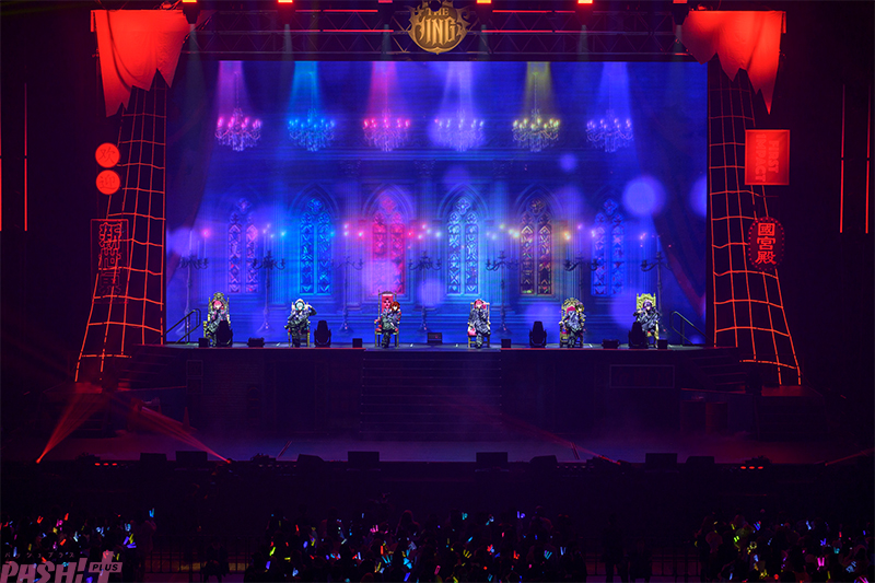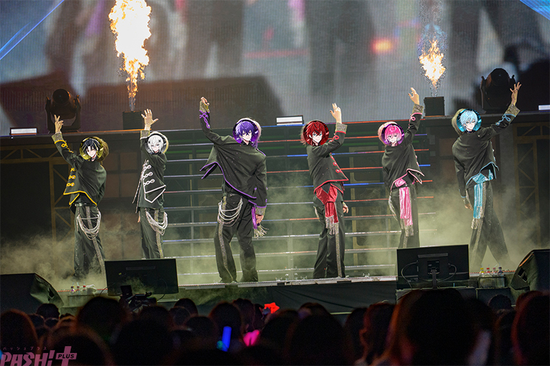 続いて、メインステージ上段に置かれた6つの玉座に、堂々たる表情で座っためておらの6人。彼らの表情にライトが当たると大歓声が巻き起こる。披露されたのは、グループとして初めての歌ってみた曲「KING(原曲:Kanaria)」だ。炎の特効やライティングといった激しい演出を、突き抜けていく6人のボーカルパフォーマンスはまさに「KING」そのものだった。