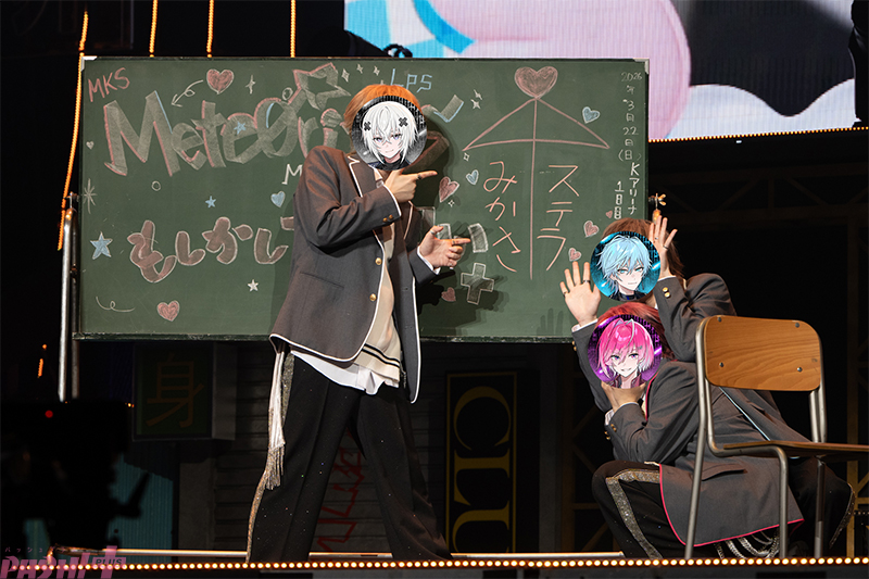 初披露となったトリオ曲でも会場は大いに盛り上がり、めておらの音楽性の幅広さを感じさせた。チャイムの音で始まったのはみかさ、メルト、Lapisによる「もしかして片想い」。制服風の衣装、教室を模した机や黒板のセット、きらきらとした青春のワンシーンを再現して歌われたキュートなラブソングだ。3人のお茶目な一面がクローズアップされ、かわいらしいやりとりや、ぬいぐるみを持ってのパフォーマンスに歓喜の声が鳴りやまない。